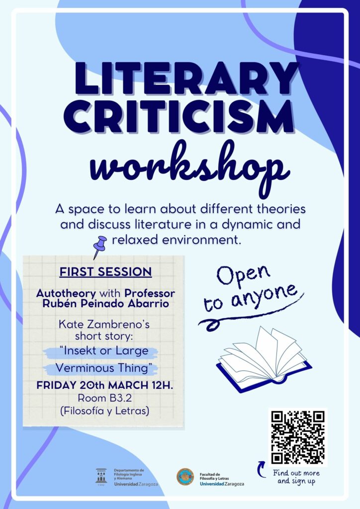 The session, titled “Autotheory and Kate Zambreno’s short story: Insekt or Large Verminous Thing,” will be led by Rubén Peinado Abarrio.